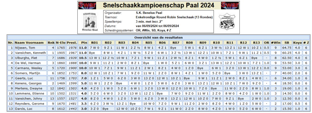 Anno 2024 werd gekozen voor een round-robin-systeem waarbij iedereen elkaar het vuur aan de schenen kon leggen. Gezien er heel wat spelers aan elkaar gewaagd waren beloofde het een zeer spannende strijd te worden. Halverwege stond Wesley Carmans met 6/6 aan de leiding met steeds een 5-tal spelers op 1 punt werd het een nagelbijter. In de laatste ronden bleek dat een herhaling van de eindstrijd van het clubkampioenschap in de maak was met Tom Nijssen en Kenneth Vansichen gedeeld aan de leiding. Ondanks het harde weerwerk van voorzitter Johny Vansichen in de laatste partij tegen zoon Kenneth was de gedeelde titel een feit.